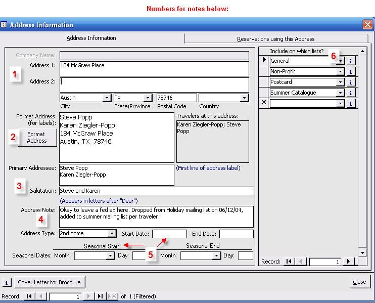 5 Address dates can be stored for the time when the address is valid. Use seasonal dates if the time is the same from year to year. Use exact dates if the address is only valid for an exact period of time. Address label reports allow you to exclude "invalid" addresses. See Marketing with Address Label reports.