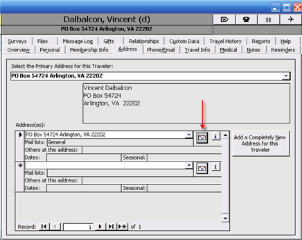3. Go to the Traveler's Address tab and click on the envelope icon to open the Address record form.