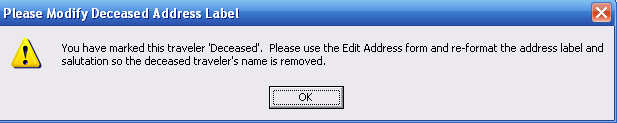 1. Marked traveler as "deceased" in the check box on bottom left corner of the Traveler Form - Personal Tab. ViaTour displays this warning: