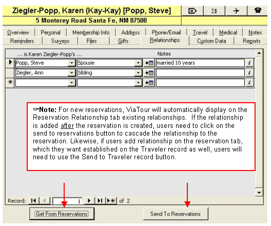 ViaTour allow users to track relationships between travelers. As long as a reciprocal relationship has been added to the code table under code class, ViaTour will auto-add the reciprocal relationship to the corresponding traveler record (see Adding Relationships in Code table