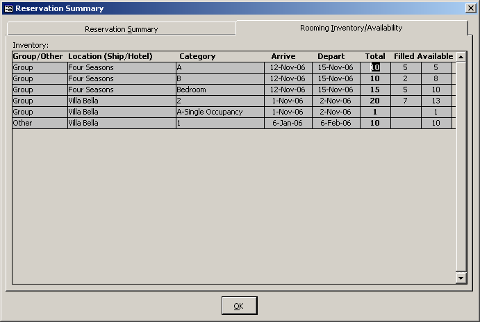 Data is displayed on one tab for non room inventory: