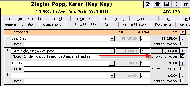 6. Show [note] on invoice?: This box, if checked, tells ViaTour to display the component note on the invoice. Sometime you will not want a note displayed.