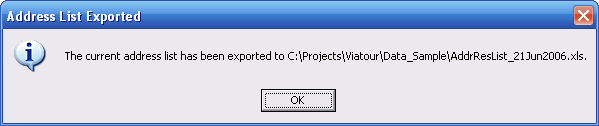4. Note that the message gives you the File Name and Path. By default ViaTour places this in the same folder where the shared data resides, with this format AddressResList_Today's date.xls.