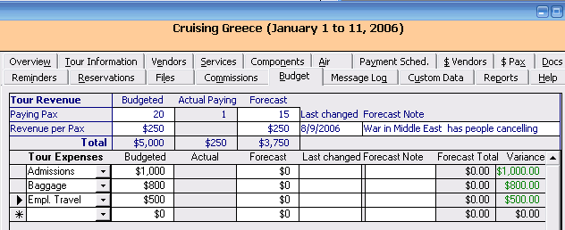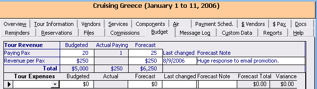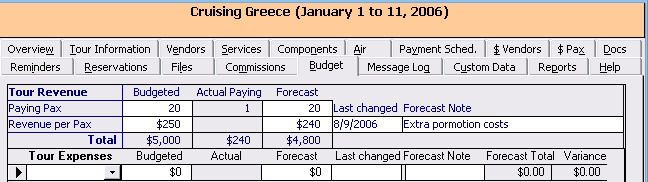 ViaTour's Tour Budget Tab allows you to project Income and Expenses and then Compare this budget compare against "actuals" to date in the interface, (Note: As of Aug 2006, reporting was still under development.)