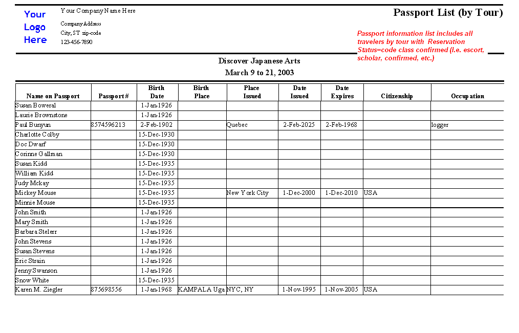Passport List by Tour (landscape format)