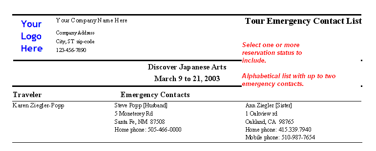 Tour Emergency Contact List Report