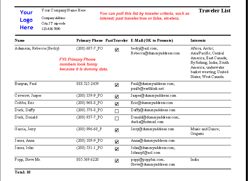 This report gives a List of travelers with phone numbers, any email that is OK to Promote, and past traveler status.