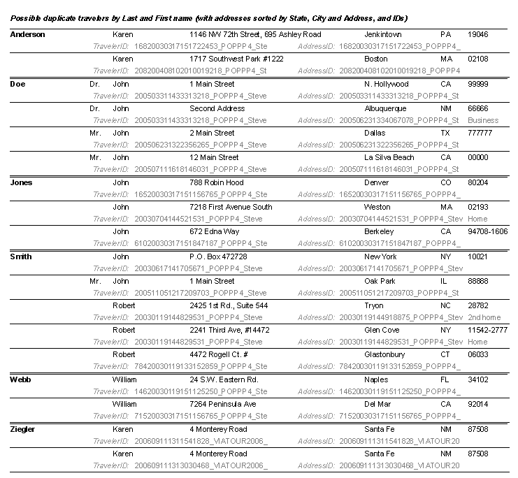 Lists travelers who have same last name and first name and shows last name, state, city and address to help users identify potential duplicates - does not take any selection criteria.