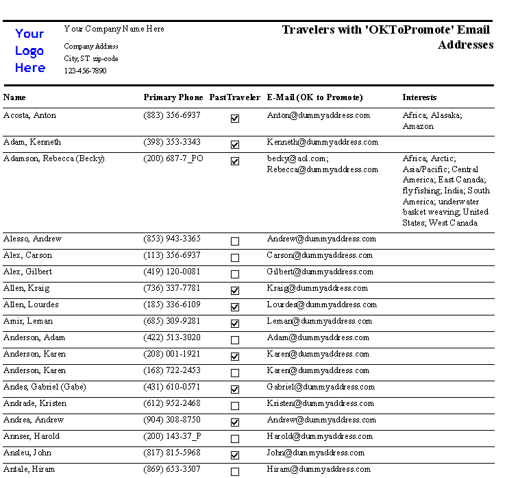 List of travelers with phone numbers, and past traveler status - allows export of email addresses to text file. Only includes travelers with "OK To Promote" Emails.
