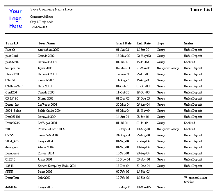 Tour List Report
