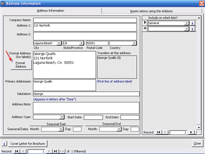 Note: You can not delete the address - because ViaTour requires an address for all reservation records. Also, marketing analysis reports look at zip code or state, and it is handy to retain this data for past travelers, even ones who are deceased.
