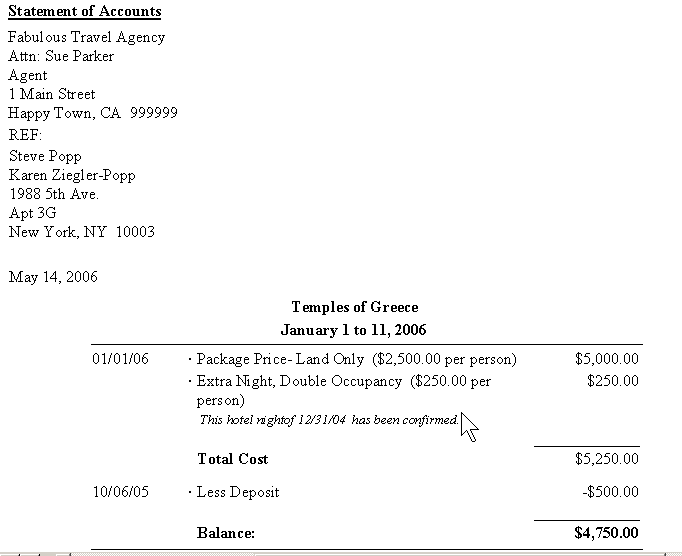 The Invoice will display the Travel Agent's Name and Address first, then under "REF" the Traveler name and address, followed by the Invoice detail.