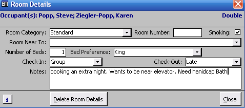 3. Now click on the Room Details button: both travelers will be listed. Add any room details to the room record, such as room category, bed preference and number of beds, adjoining others rooms, notes, etc.