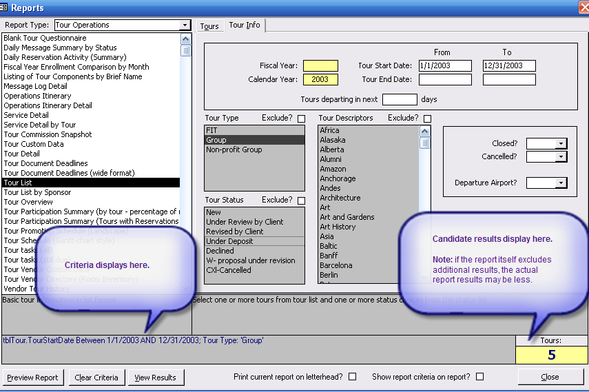 1. View results vs. actual report results: The "View results" button will display the selected criteria in the gray box and give you a count of candidate results. Because some reports have "built in" additional criteria requirements (which may further limit results) the number in the candidate results may differ from actual report results. Candidate results is only intended as guideline. Furthermore, candidate results reflect the table the query is based on, not necessarily the same as the report output.