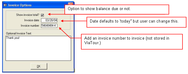 When you click the Generate Invoice button, a form appears that allows you to specify the Invoice Date (it will default to the current date) and to indicate whether you want a Total Balance Due to appear.