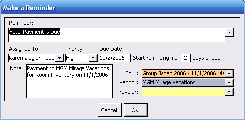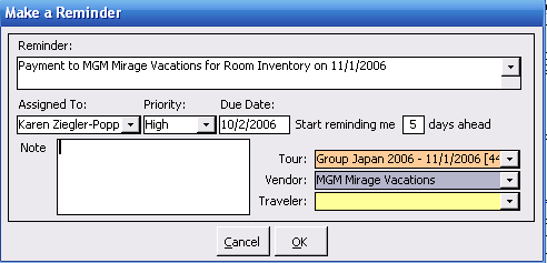 Note: Auto-reminders are "unique" and therefore are not copied between tours. If you are creating a reminder that you would like to "make standard" you can delete the name of the reminder (or cut and paste it into the reminder notes fields) and then select a Standard Reminder from the list.