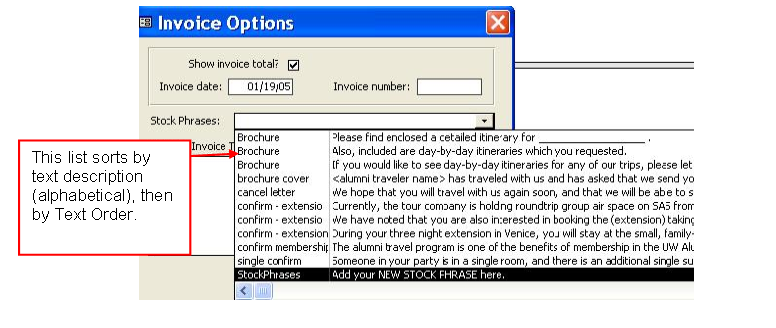 d. Assign a text order, which will control where it is displayed on the Optional Text form. (The StockPhrases drop down list sort alphabetically on Text Description, then puts each sentence in order based on the number value in the Text Order field.)