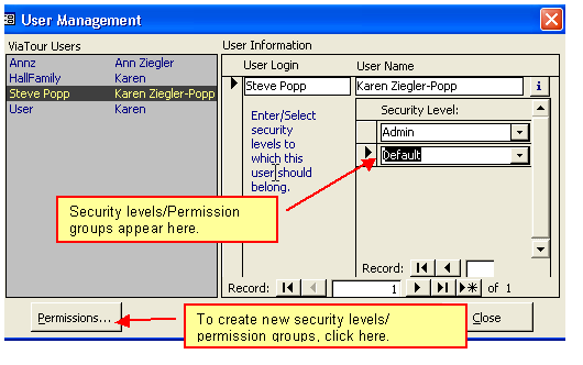 7. To create New Group, type the new name in the Security Level field, and add the permissions you wish to associate with that group.