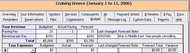 ViaTour's Tour Budget Tab allows you to project Income and Expenses and then Compare this budget compare against "actuals" to date in the interface, (Note: As of Aug 2006, reporting was still under development.)