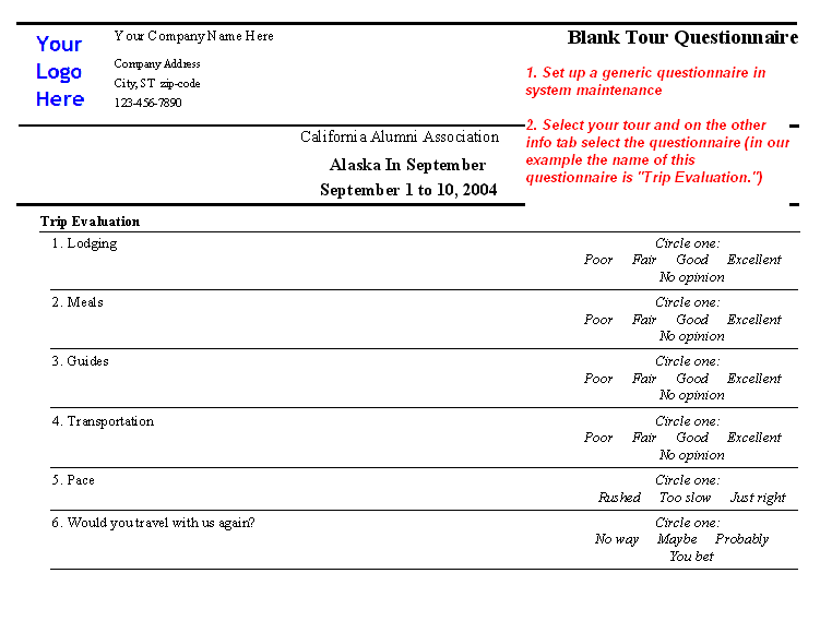 Blank Tour Questionnaire Report