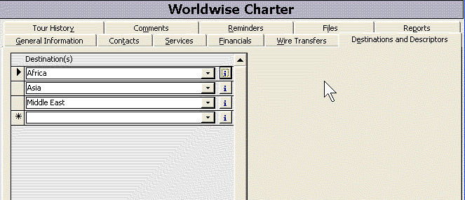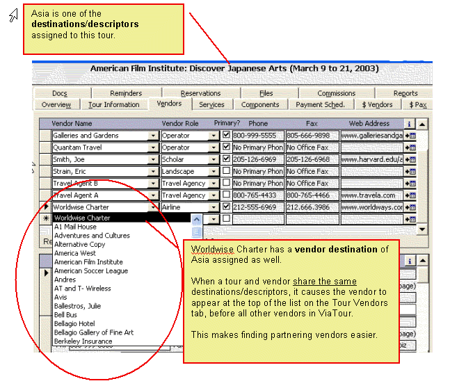 Assigning a destination to a vendor's record not only gives you additional information about this vendor, but it also determines how this vendor appears on the Tour Vendors Form drop down list. (See Vendors for a Tour)