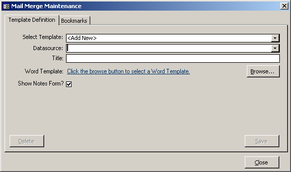3. The MAIL MERGE MAINTENANCE form will open.This form is used to add new reports to Reports form (link to create templates) to map the fields in ViaTour to the template bookmarks (and maintain them if you edit your template) , to change report titles, and to edit the option of using ViaTour's Notes Form.