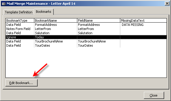 In my example below only my bookmark called "Today" (meaning today's date) was not matched. ViaTour set the Book Mark Type to "ignore". However, I want Today's date in my letter (I don't want to ignore it!) so I need to edit the bookmark.