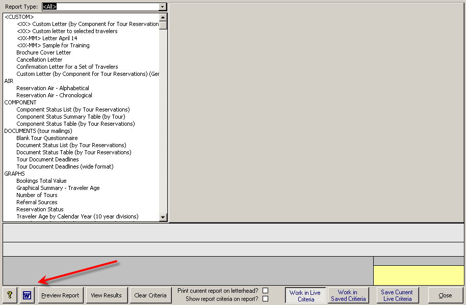 2. Click on the Word Icon (blue ) at the bottom left of reports form
