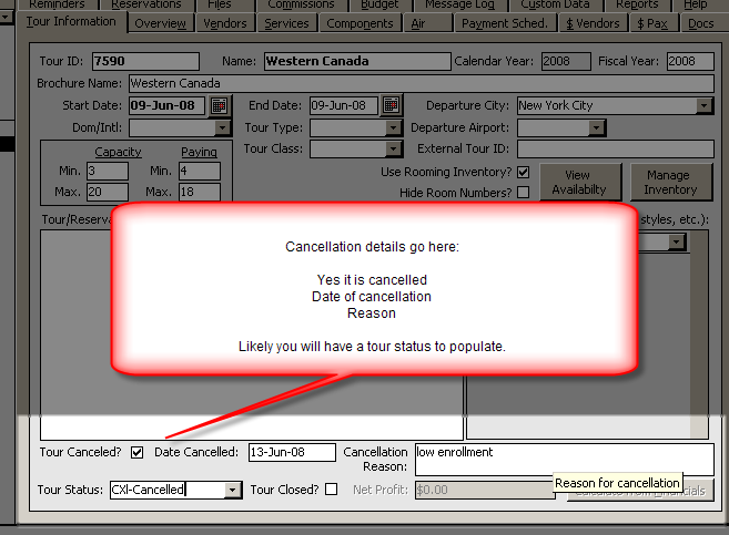 When a Tour is cancelled there are 3 fields possibly 4 fields to populate:
